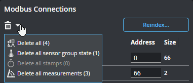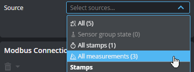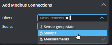 Lets you add sources (such as stamps or measurements) to send over the protocol. Added connections appear in the Modbus Connections section at the bottom of the panel. If you have many sources, you can filter them by type to make it easier to find the source you want in the Source drop-down . You can enable more than one filter.
