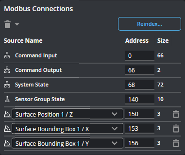 Use Reindex... to remove gaps of unused addresses between connections. You can also use Reindex... to set the value of the first index. |
