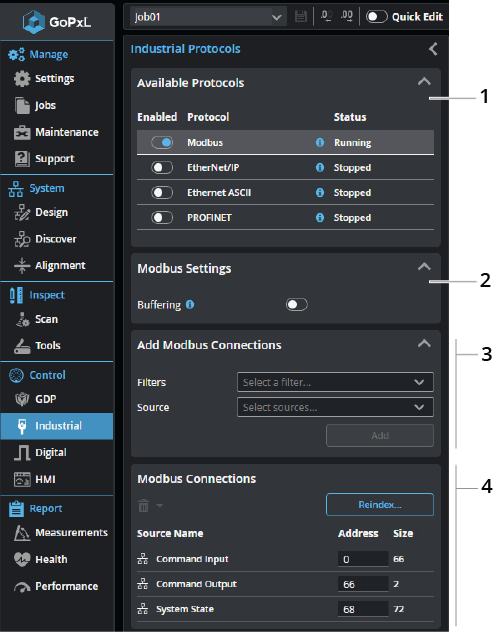 You configure the protocol on the Control > Industrial page. After configuring the Modbus protocol in GoPxL (see below), use the information in Modbus TCP Protocol Format - PLC Information to configure your PLC.