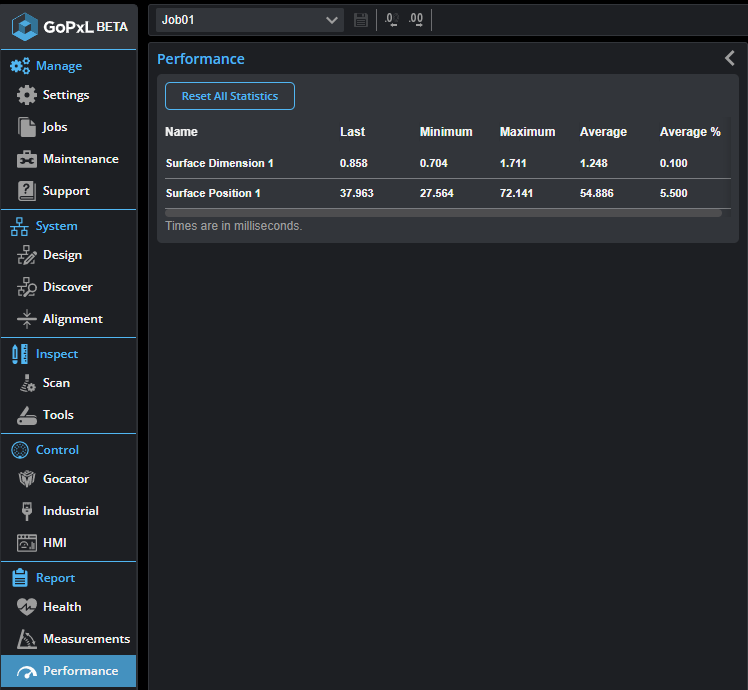 The ReportPerformance page displays performance statistics (execution time in milliseconds) for each tool added in the Inspect page.