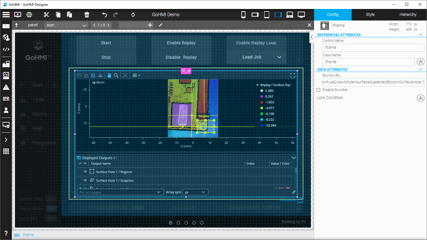 The default HMI app includes an IFrame widget configured to display the data viewer. The IP address used in the link is 127.0.0.1:8100, which is valid for a PC instance of GoPxL (if one is running at that address and port).