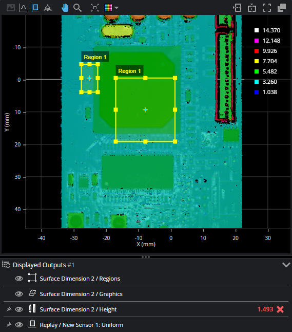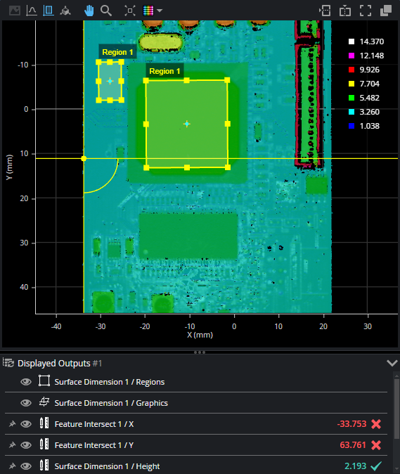 For example, the following shows a surface scan of a PCB. A Surface Dimension height measurement returns the height of a component in the measurement region relative to a nearby reference region; the height is between the measurement's thresholds and is a pass (the green value in the Displayed Outputs pane).
