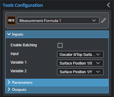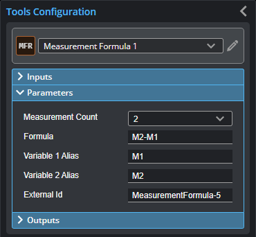 The Measurement Formula tool lets you create a mathematical expression containing aliases to one or more measurements from other measurement tools, up to a maximum of 20. The result of the calculation is returned in the tool's Result measurement.