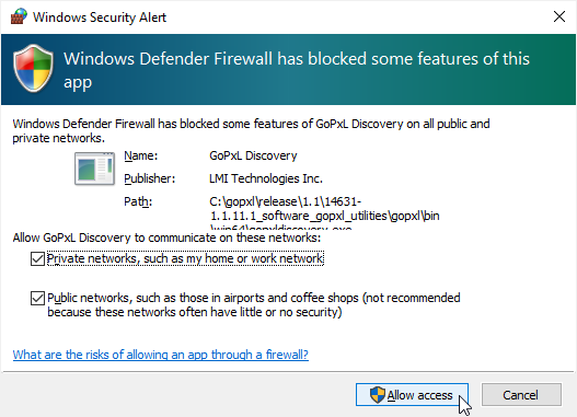 Your firewall may ask if you want to allow the GoPxL Service Application and Python to communicate over your network. To avoid issues, LMI recommends allowing communication over both Public and Private networks. Because the notifications appear one on top of the other, make sure to check the appropriate boxes and carefully click Allow access for both alerts.