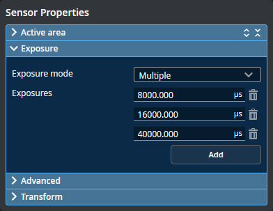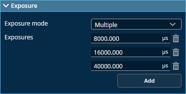 You can define up to five exposures (three for G3 sensors), with each set to a different exposure level. You add exposures using the Add button, and remove them using the trashcan icon.