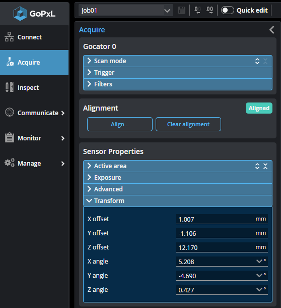 The transformation values determine how data is converted from unaligned coordinates to aligned coordinates (for an overview on coordinate systems, see Coordinate Systems). Transformation values are set automatically when you align a sensor using an alignment routine on the Acquire page. The resulting transformations are displayed in the expandable Transform section on that page.