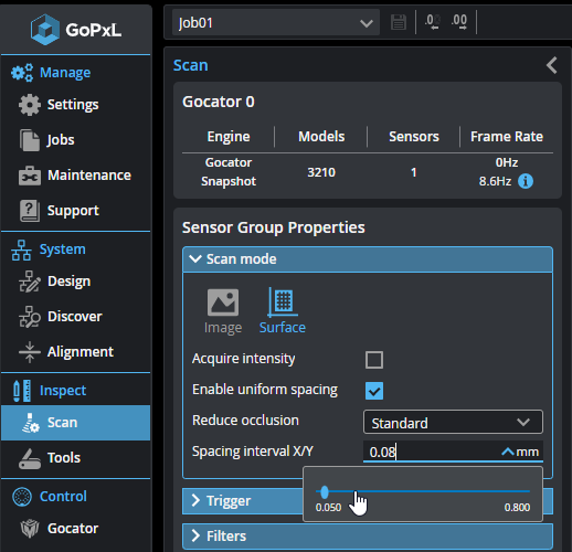 When Enable uniform spacing is checked, data points are resampled to a uniform spacing. Set the size of the spacing using the Spacing interval x/y parameter in the Sensor Properties section (see below).