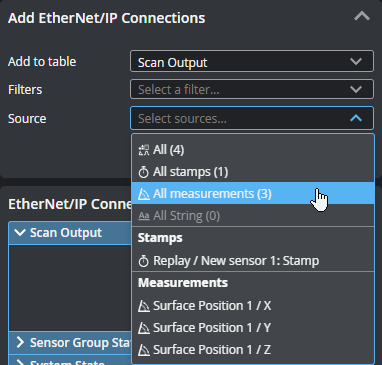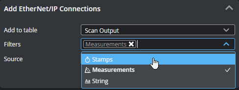 Lets you add sources (such as stamps, measurements, or strings) to send over the protocol. Added connections appear in the EtherNet/IP Connections section at the bottom of the panel. When GoPxL is running on a standalone sensor (one not controlling others), Add to Table only contains one value (Scan Output) that represents a register assembly. When GoPxL is running on a sensor controlling other sensors, or on a PC or GoMax NX, Add to Table contains an additional entry (Sensor Group State). Use this to choose which register a source is added to. If you have many sources, you can filter them by type to make it easier to find the source you want in the Source drop-down . You can enable more than one filter.
