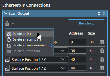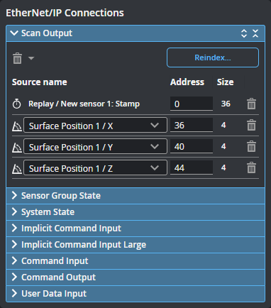The connections listed here will be sent by the protocol to a compatible PLC. You can delete a connection using the trashcan icon in its row, or change its ID. When changing an ID, make sure to use the size of the source to correctly calculate the minimum offset.