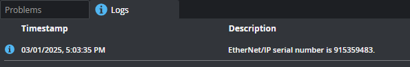 When you enable the protocol, a log entry displays the EtherNet/IP serial number you should use in your PLC.