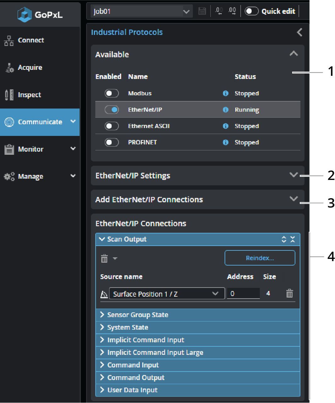 You configure the protocol on the Communicate > Industrial page. After configuring the EtherNet/IP protocol in GoPxL (see below), use the information in EtherNet/IP Protocol Format - PLC Information to configure your PLC.