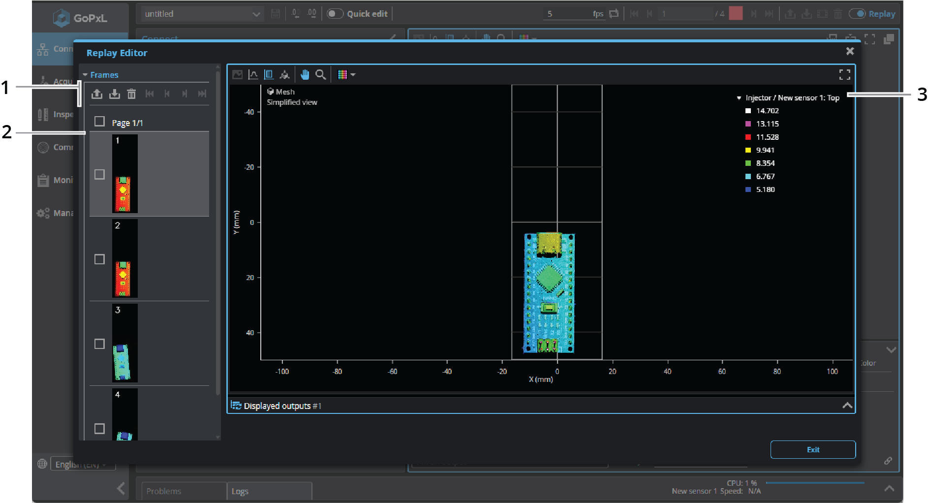 The replay editor lets you add or remove frames of recorded data in the sensor's buffer.