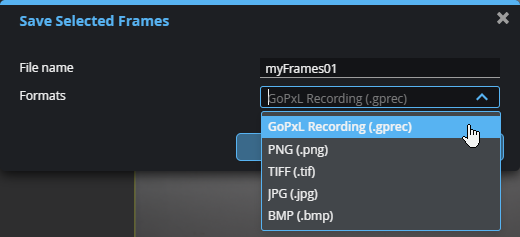 Download - Lets you download the currently selected frame or frames. You can select multiple frames by clicking the checkbox next to each frame you want to download. When you click the Download button, you must provide a file name and a format for the download. If you choose GoPxL Recording, a .gprec file containing the selected frames is downloaded. If you choose one of the image formats, an image file or a .zip file containing multiple image files is downloaded.