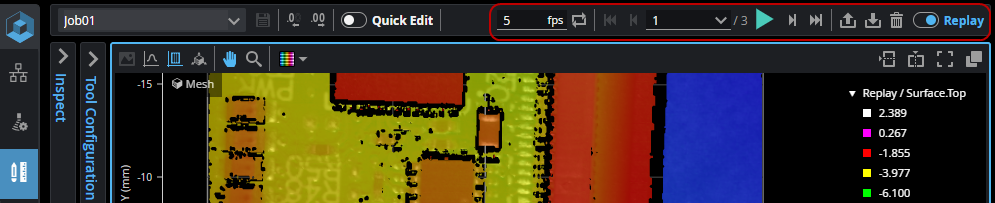| 1 | Playback rate and repeating frames | When "Repeat frames" ( ) is enabled, scan data is played back in a loop. This is useful when inspecting data or configuring tools using recorded data, and also for demos. |
